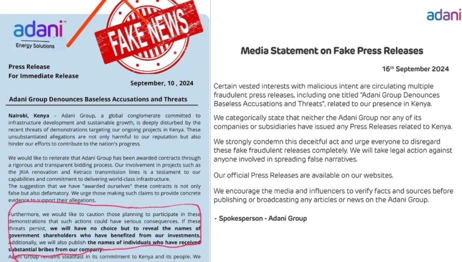 A spokesperson of Adani Group said in a statement, “Certain vested interests with malicious intent are circulating multiple fraudulent press releases, including one titled “Adani Group Denounces Baseless Accusations and Threats”, related to our presence in Kenya. We categorically state that neither the Adani Group nor any of its companies or subsidiaries have issued any Press Releases related to Kenya. We strongly condemn this deceitful act and urge everyone to disregard these fake fraudulent releases completely.