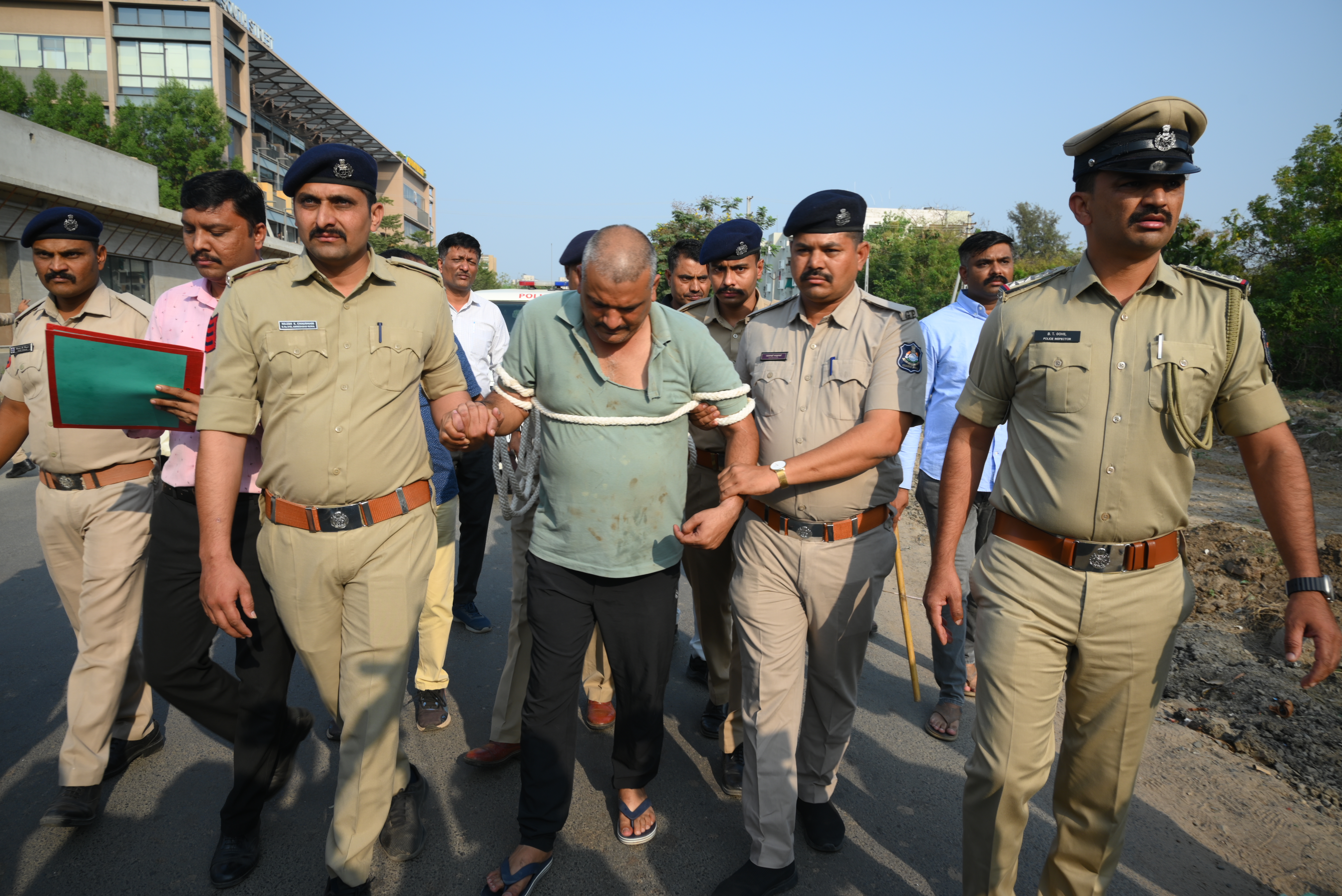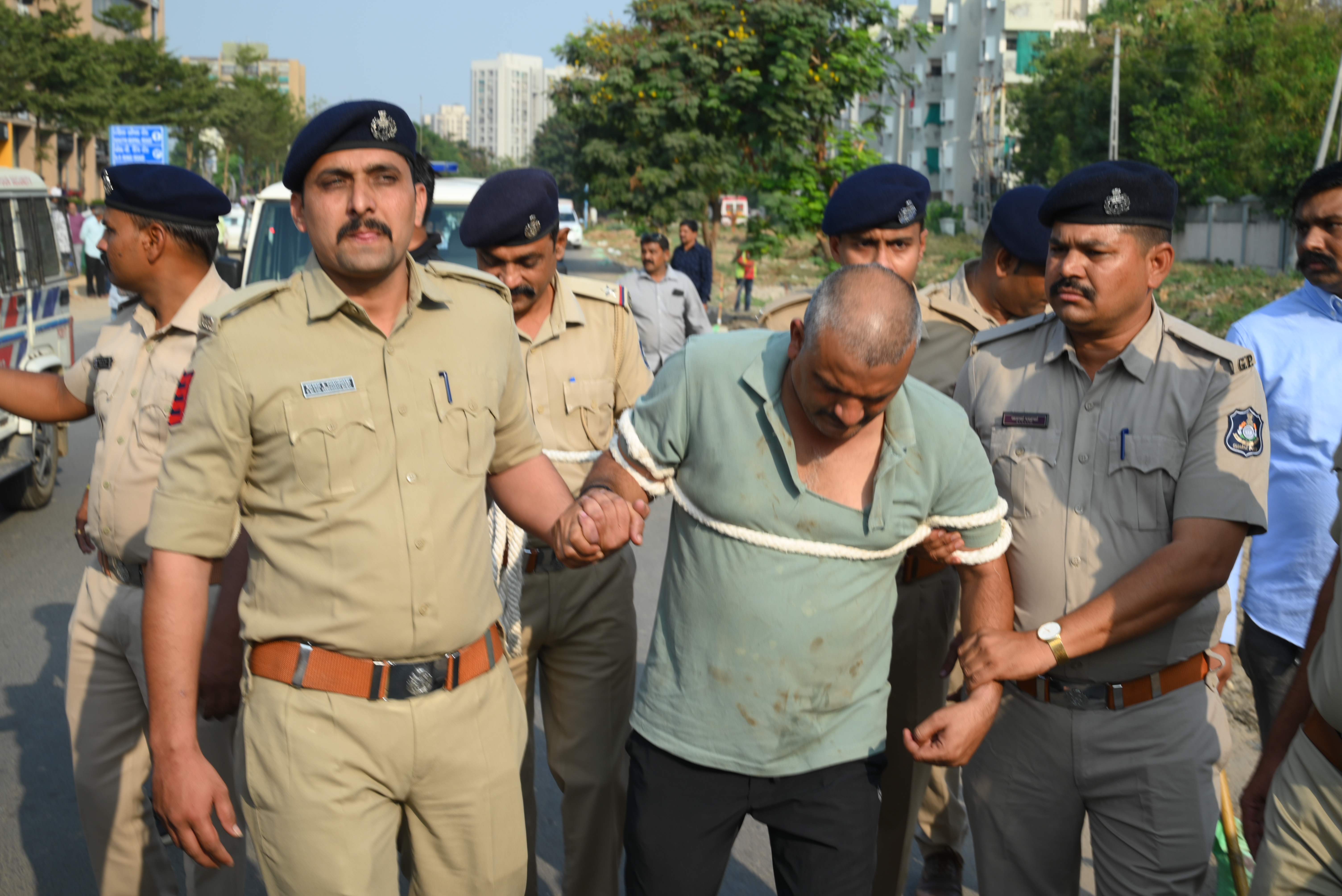 The accused, Constable Virendrasinh Padheriya, was taken to the scene of the crime for the reconstruction, where he was reportedly seen struggling to walk and became visibly emotional during the process.