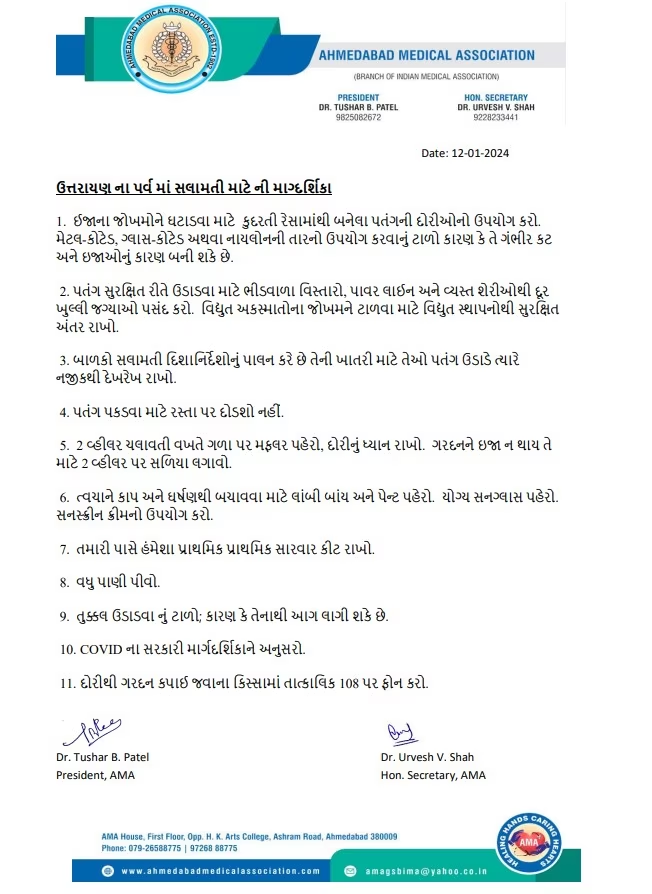 The Ahmedabad Medical Association has released a set of guidelines for the Uttarayan festival, advising against the use of metal-coated, glass, and nylon strings. The guidelines also recommend flying kites in safe places to avoid electrical accidents.