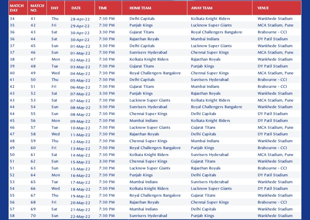 The schedule for the Playoffs and the TATA IPL 2022 final to be played on 29th May will be announced later, the BCCI said.
