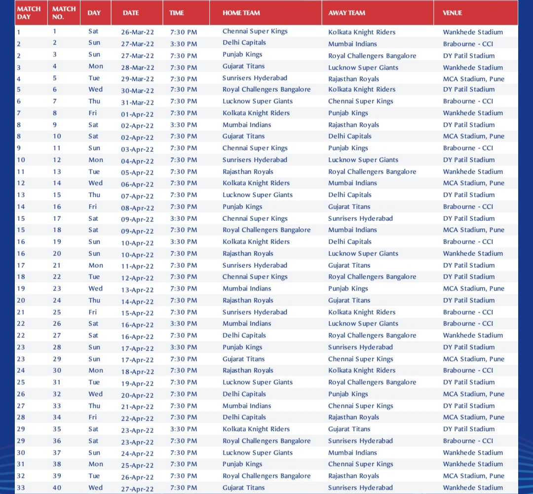 There will be a total of 12 double headers, with the opening match beginning at 3:30 p.m. IST. All evening matches will begin at 7:30 p.m. IST.The last game of the league round will be contested on May 22nd at the Wankhede Stadium between Sunrisers Hyderabad and Punjab Kings.