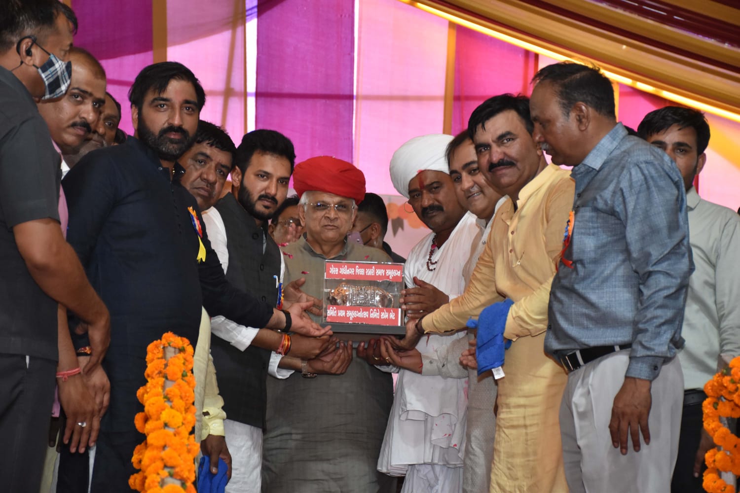 Leaders of the Rabari community welcomed CM Patel with garlands of roses and a turban. They also presented him with a memento. Patel blessed all the newly weds and wished them a very happy and successful married life.