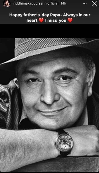 In an emotional post, Riddhima Kapoor remembers Rishi Kapoor. She posts a black-and-white picture of the legendary actor and puts up a caption, “Happy Father’s Day Papa. Always in our hearts, I miss you.”
