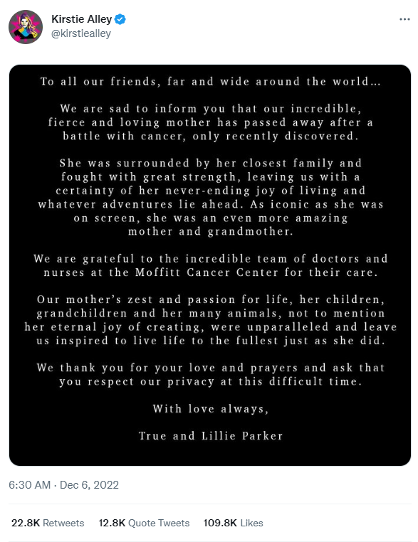 Her children’s statement read, “As iconic as she was on screen, she was an even more amazing mother and grandmother.”