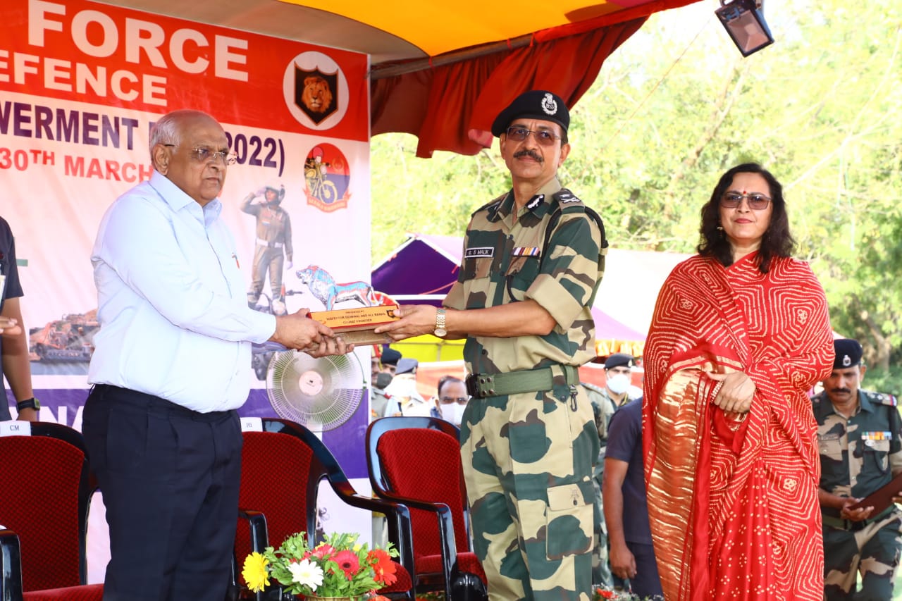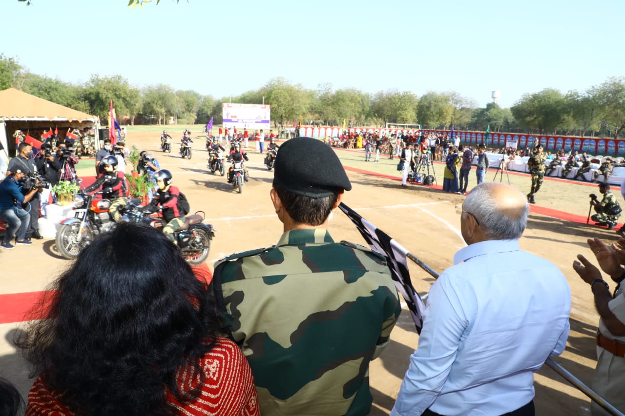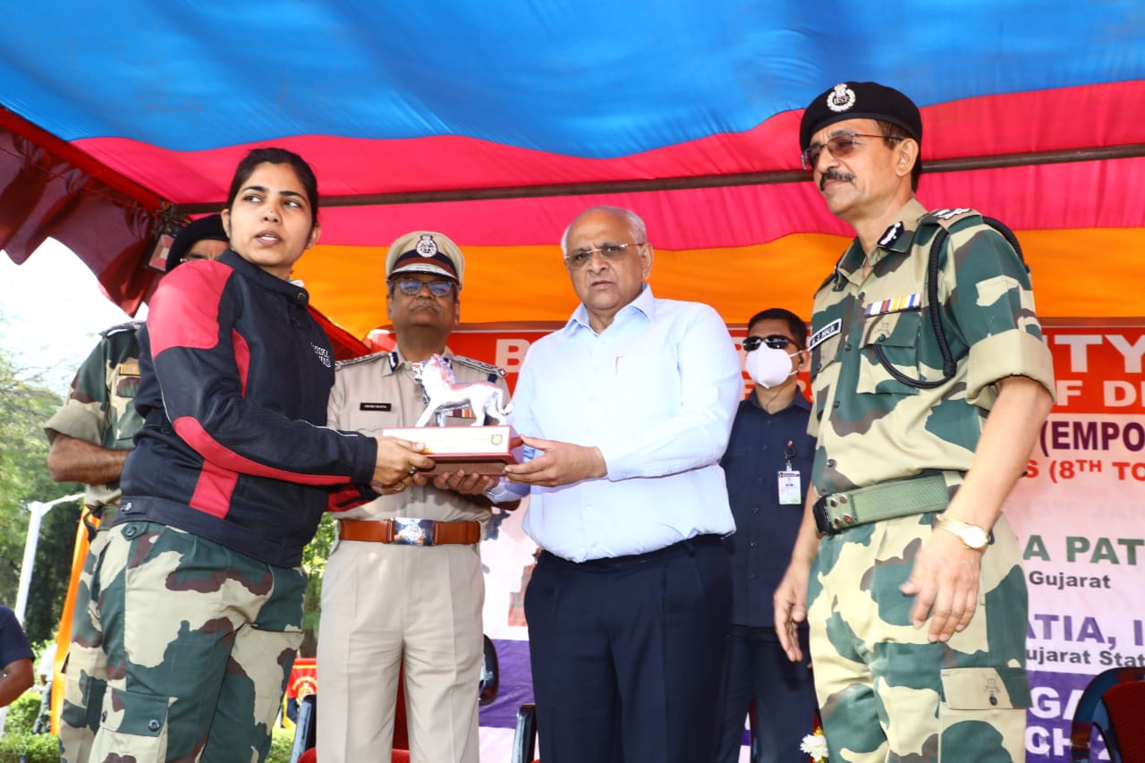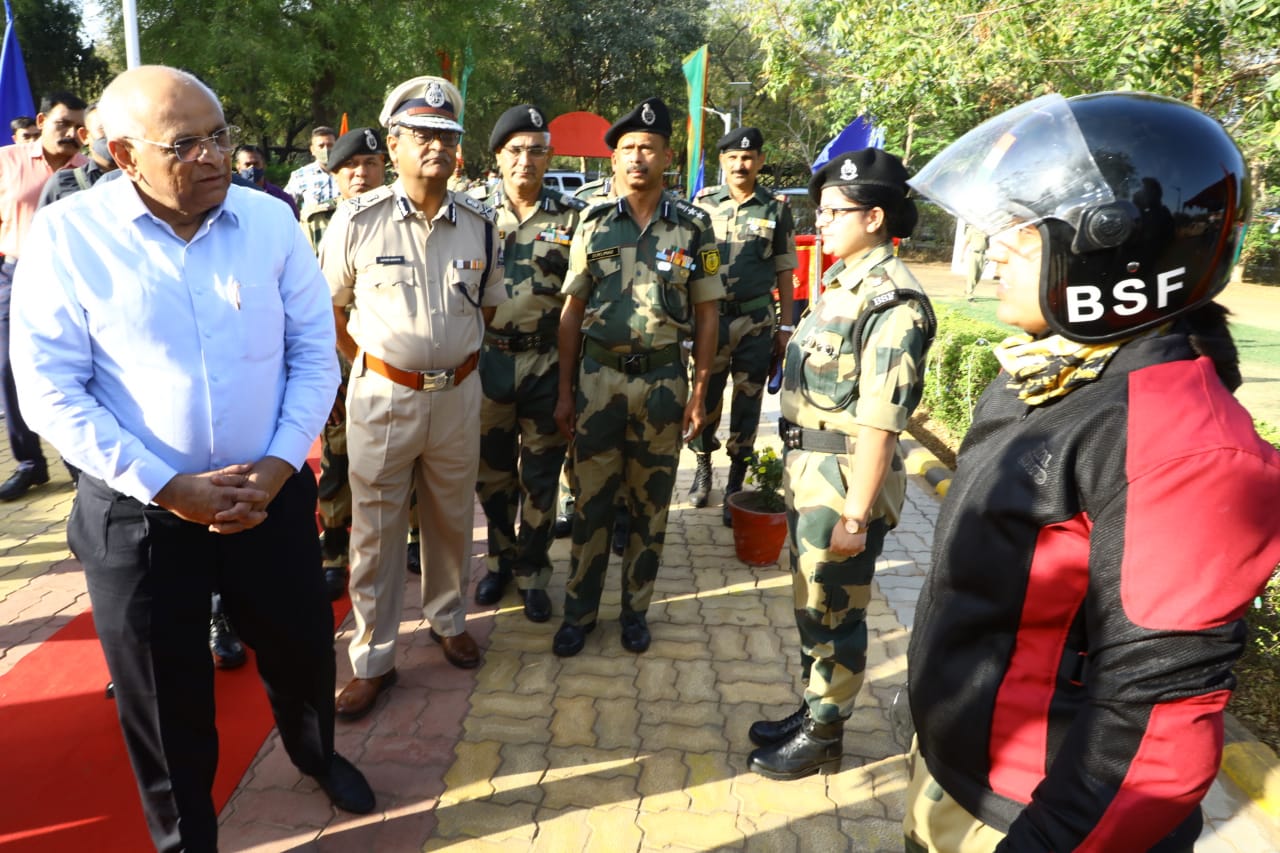 Bhupendra Patel congratulated Royal Enfield motorcycle rider BSF women for their unparalleled adventure and prowess. Gujarat DGP Ashish Bhatia and Inspector General of BSF Gyanendrasinh Malik and other officers of the BSF were also present.