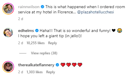 “This is what happened when I ordered room service at my hotel in Florence,” Wilson shared on social media, sparking reactions from his ‘The Office’ co-stars Ed Helms, who played Andy and Kate Flannery, who portrayed Meredith.