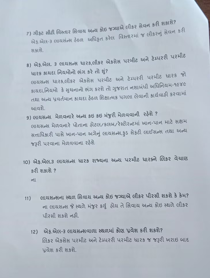 If the license holder, Liquor Access Permit and Temporary Permit holder violates the law, rules or instructions, then action will be taken to take punitive action under the Gujarat Narcotics Control Act-1949 and other existing laws.