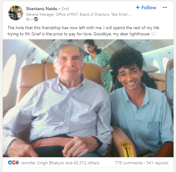 In a LinkedIn post, Naidu reflected on his friendship with Tata, focusing not on his business achievements but on the bond they shared. “The hole that this friendship has now left with me, I will spend the rest of my life trying to fill. Grief is the price to pay for love. Goodbye, my dear lighthouse,” wrote Naidu, who is the 30-year-old General Manager at the Office of Ratan Tata. He also shared a nostalgic photo of the two together.