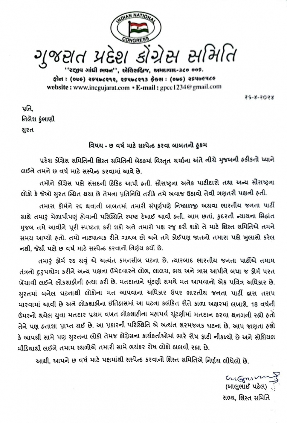 The Gujarat Pradesh Congress Committee (GPCC) has announced the suspension of Nilesh Kumbhani, their candidate for the Surat Lok Sabha seat, for six years.