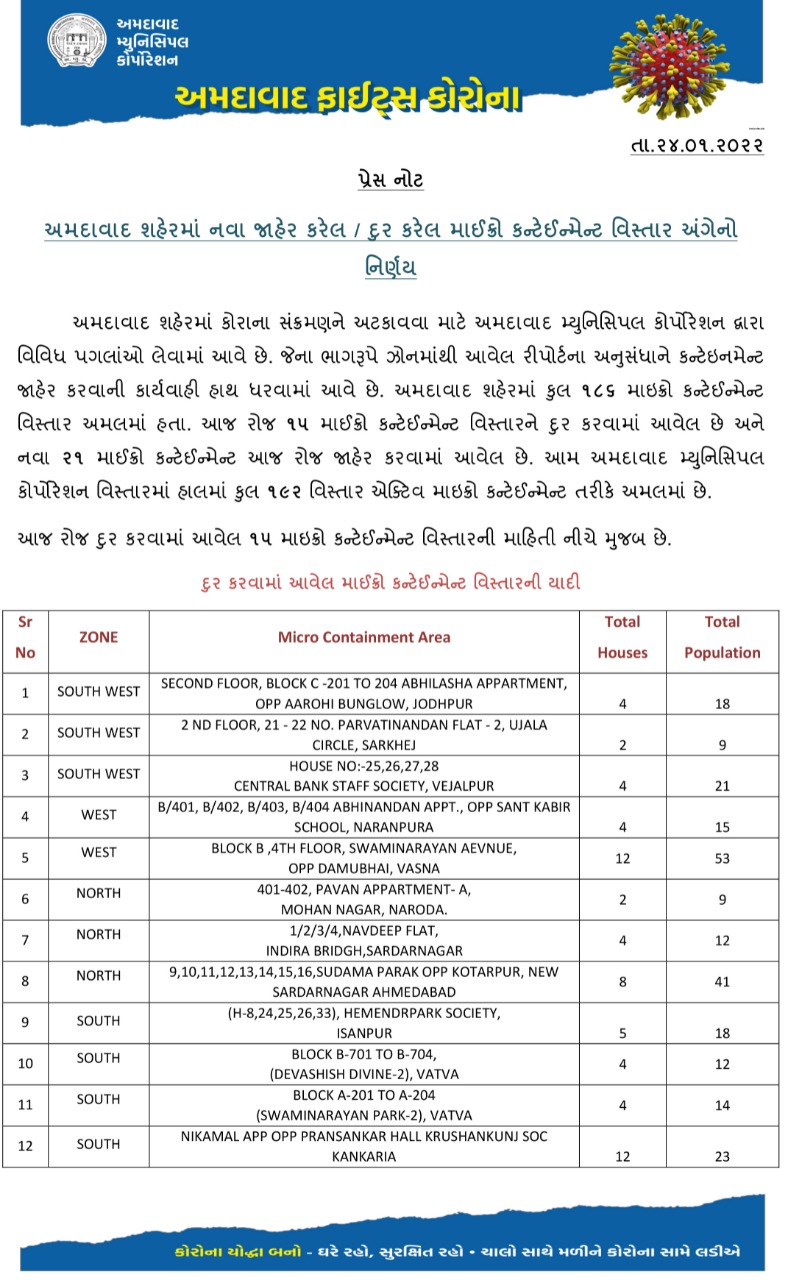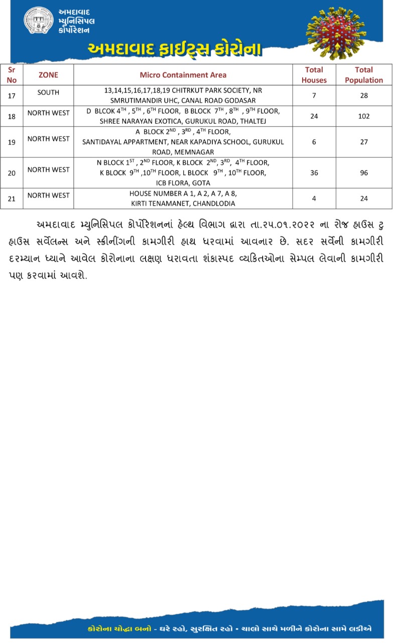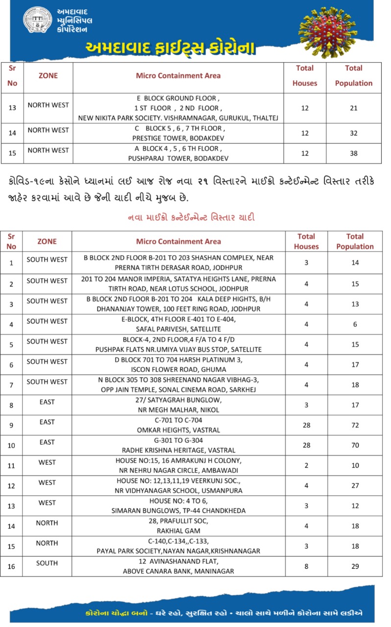Ahmedabad Municipal Corporation on Monday added 21 more Covid-19 Micro Containment Zones in the City while removing 15 such zones from the list. With today’s update, there are a total of 192 active micro containment zones.