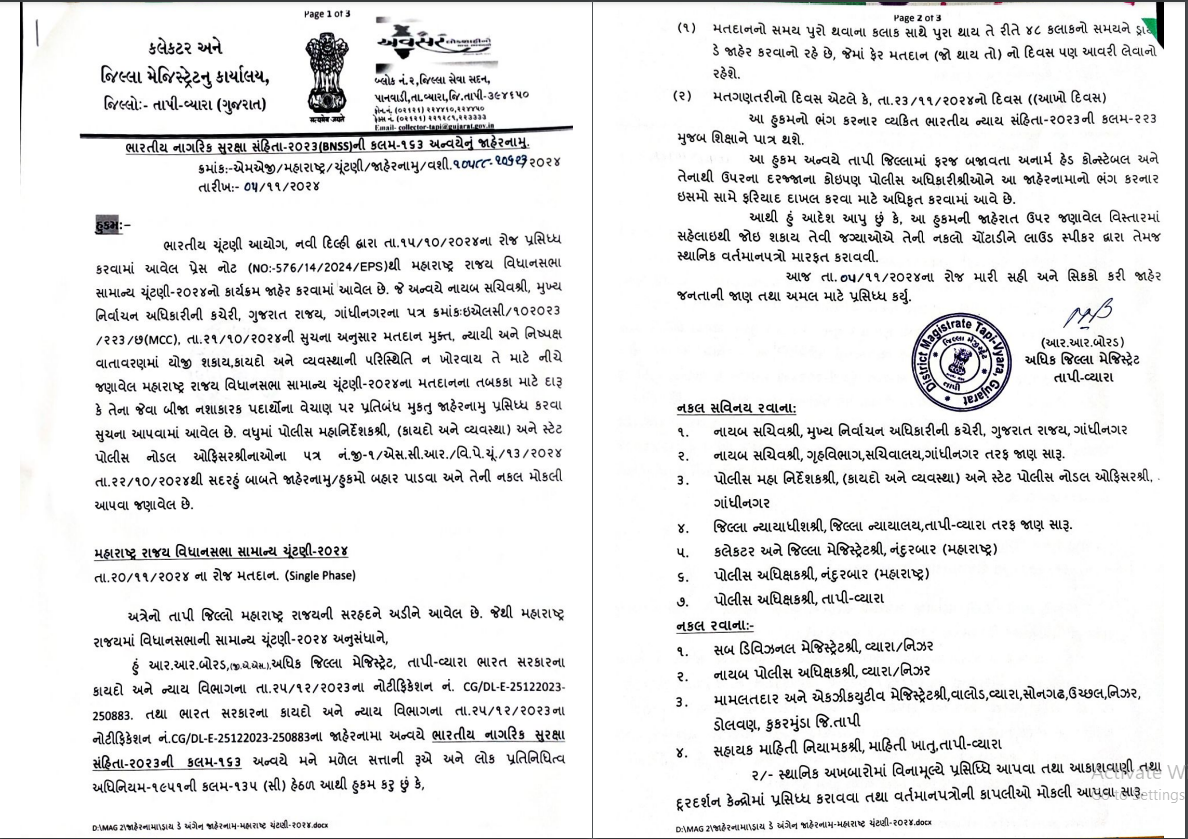 The notification, issued November 5, references the October 21 order from the State Electoral Officer’s office in Gandhinagar. This order instructed a public notification to prohibit the sale of alcohol and other intoxicating substances to ensure a free and fair election and maintain law and order during the Maharashtra legislative assembly election.