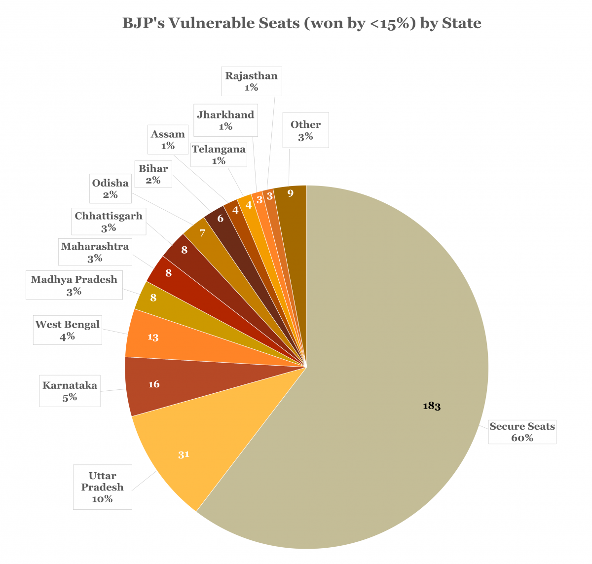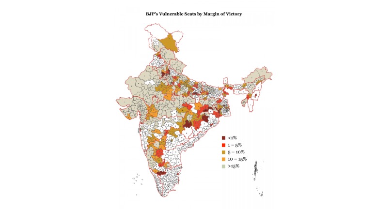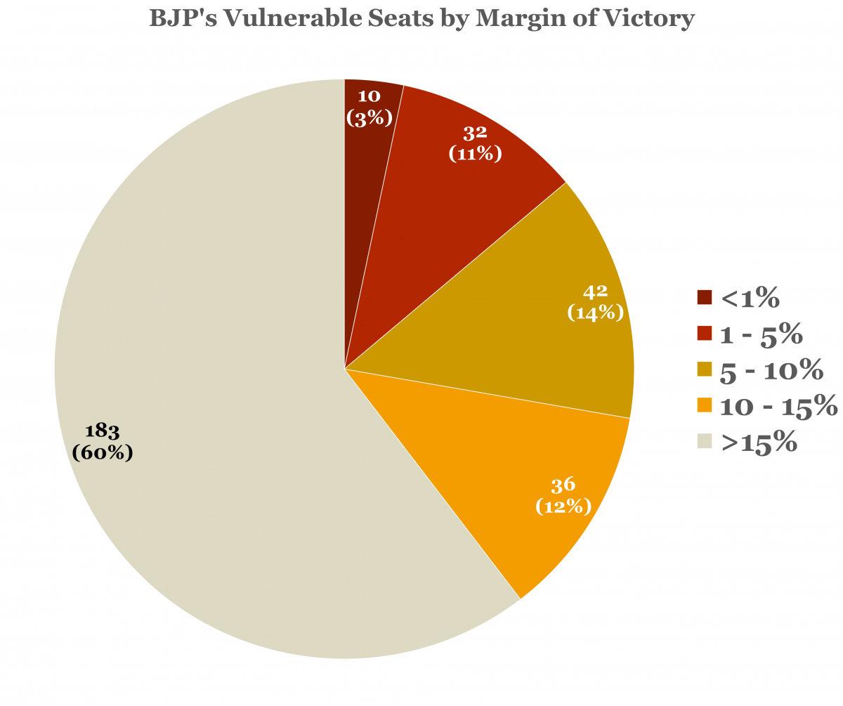 जैसा कि नीचे दिए गए चार्ट से पता चलता है, जबकि भाजपा ने 2019 में 60% (183 सीटें) सीटें 15% से अधिक के अंतर से जीतीं, इसने 40% (120 सीटें) कम अंतर से जीतीं, जिससे वे उन चुनावों में कमजोर हो गए जहां 5-10% का बदलाव सामान्य है और यह बहुत अधिक हो सकता है, विशेष रूप से वे दस सीटें जो इसने 1% से कम के अंतर से जीतीं और 32 सीटें जो 5% से कम अंतर से जीतीं।