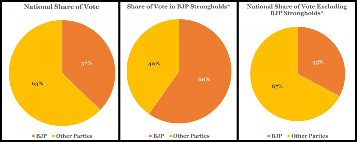 जब राष्ट्रीय वोट शेयर में इसकी गणना की जाती है, तो ये अतिरिक्त वोट भाजपा की राजनीतिक ताकत के बारे में नहीं तो कम से कम उस राजनीतिक गति के बारे में अतिरंजित दृष्टिकोण व्यक्त करते हैं जो इसे आगे बढ़ाने में मदद कर सकती है। जबकि भाजपा अपने गढ़ों में अनावश्यक रूप से 60% वोट जीतती है, उसके पास अन्य जगहों पर आधे से थोड़ा अधिक वोट है, जहां उसे इसकी आवश्यकता है।