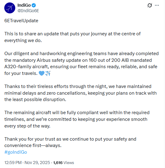 सभी एयरलाइंस ने यात्रियों को भरोसा दिलाया है कि वे तय समय सीमा के भीतर काम पूरा कर लेंगे और फिलहाल किसी भी फ्लाइट कैंसिलेशन की योजना नहीं है। हालांकि, मामूली देरी या री-शेड्यूलिंग हो सकती है।