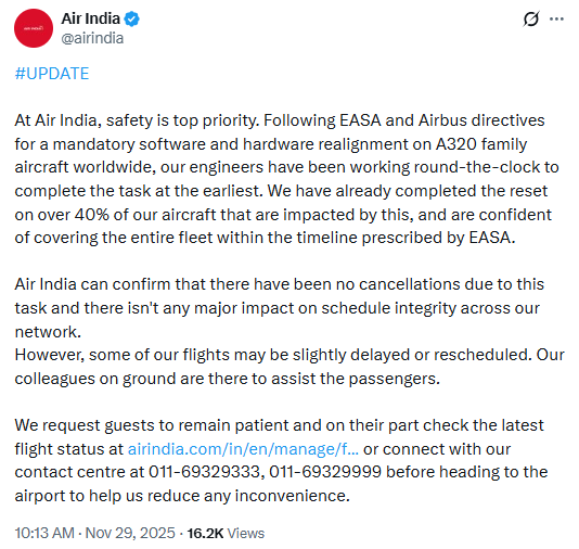 - IndiGo: कंपनी के पास 195 A320 विमानों का बेड़ा है। DGCA के निर्देशानुसार, IndiGo के 200 विमानों (सभी A320 वेरिएंट्स मिलाकर) में संशोधन की जरूरत है। एयरलाइन ने शनिवार दोपहर बताया कि उन्होंने प्रभावित 200 में से 160 विमानों (80%) का काम पूरा कर लिया है।