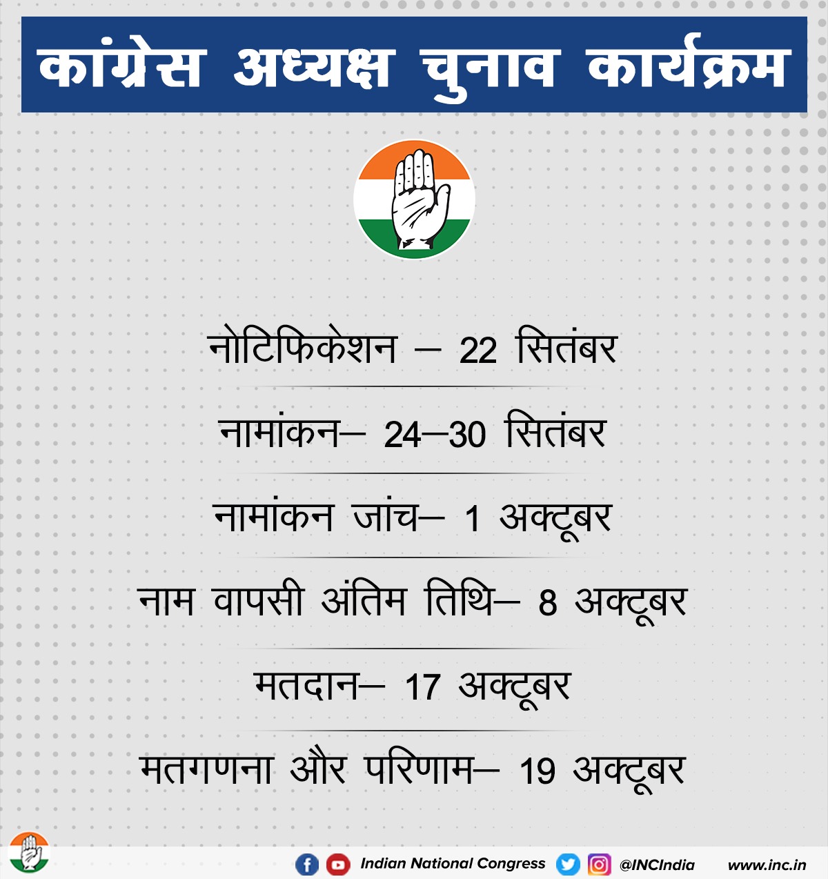 कांग्रेस को 19 अक्टूबर को मिलेगा नया अध्यक्ष , चुनाव कार्यक्रम घोषित