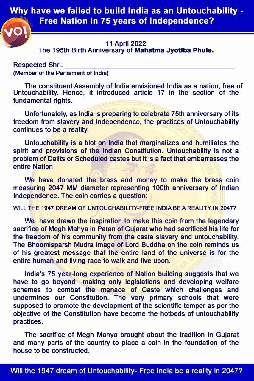 गुजरात के वयोवृद्ध दलित नेता मार्टिन मैकवान, जो एक अधिकार संगठन नवसर्जन ट्रस्ट चलाते हैं, ने बुधवार को कहा कि समुदाय ने एक अद्वितीय पीतल का सिक्का विकसित किया है जिसमें इस सवाल को उकेरा गया है: “क्या 1947 में अस्पृश्यता मुक्त भारत का सपना 2047 में सच होगा?”