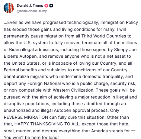 ट्रंप ने अपने सोशल मीडिया प्लेटफॉर्म ‘ट्रुथ सोशल’ पर लिखा, “मैं अमेरिकी सिस्टम को पूरी तरह से रिकवर होने का मौका देने के लिए सभी थर्ड वर्ल्ड देशों से माइग्रेशन को स्थायी रूप से रोक दूंगा। बाइडेन के कार्यकाल में हुए लाखों अवैध प्रवेशों को रद्द किया जाएगा, जिनमें ‘स्लीपी जो बाइडेन’ के ऑटोपेन (Autopen) द्वारा साइन किए गए मामले भी शामिल हैं।”