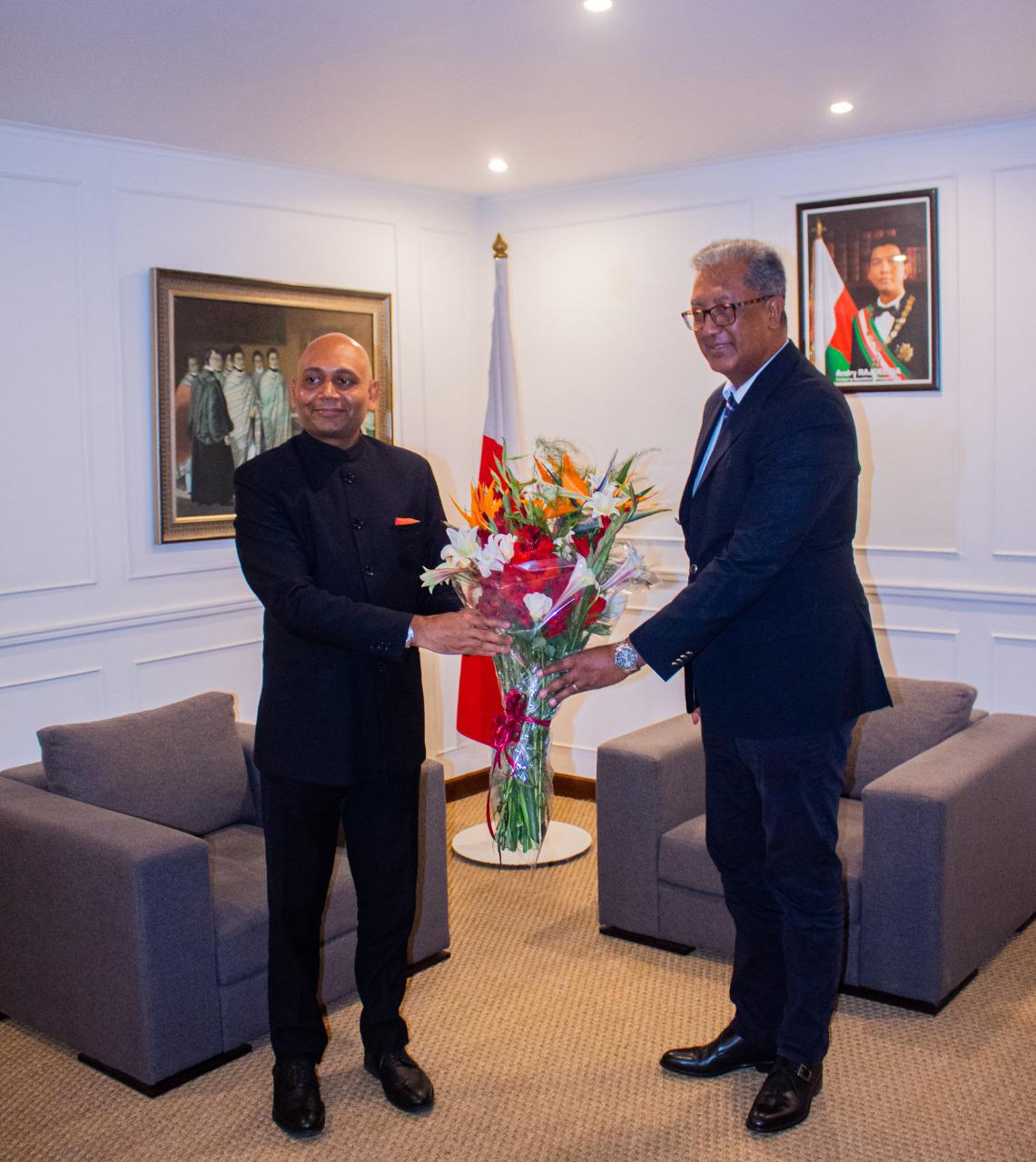 सोमवार को, राजदूत अभय कुमार ने मेडागास्कर के अपने समकक्ष महामहिम रिचर्ड जे. रैंडीमंदरातो से मुलाकात की और उन्हें विदेश मंत्री डॉ. एस. जयशंकर की पुस्तक ‘इंडिया वे’ भेंट की। उन्होंने भारत और मेडागास्कर के बीच द्विपक्षीय संबंधों की प्रगति पर चर्चा की।