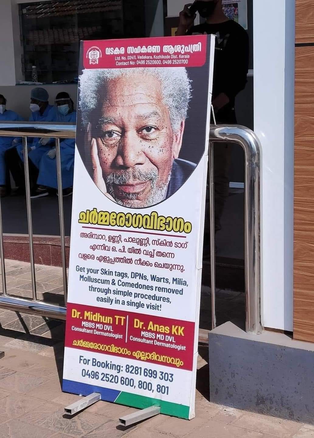 वयोवृद्ध अभिनेता मॉर्गन फ्रीमैन की तस्वीर का इस्तेमाल केरल के एक अस्पताल ने अपनी त्वचा उपचार सुविधाओं का विज्ञापन करने के लिए किया था। अस्पताल ने अब माफी मांगी है। वडकारा सहकारी अस्पताल द्वारा विज्ञापित सेवाओं में मस्से, त्वचा के टैग, मिलिया और मोलस्कम को हटाना शामिल था।
