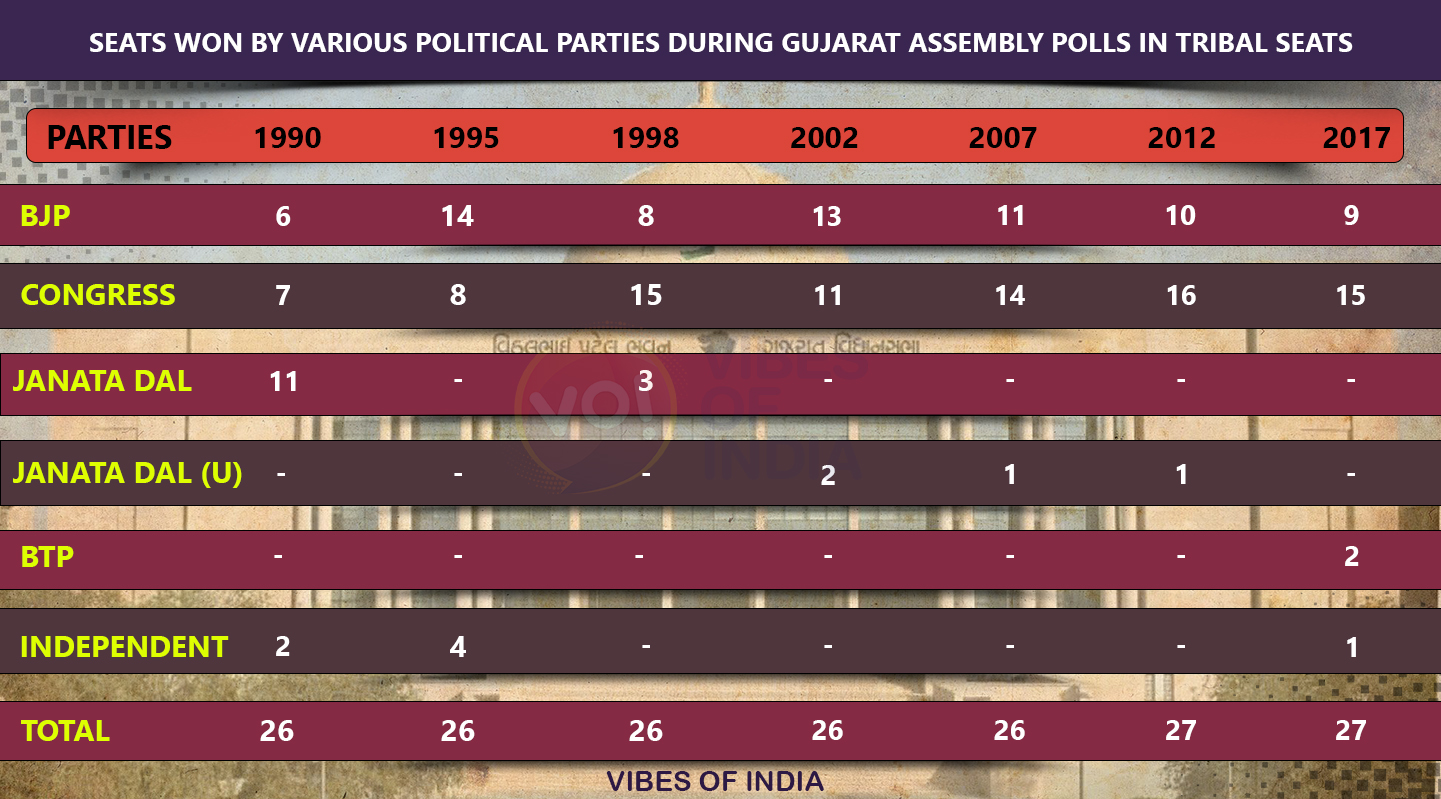खासतौर से आदिवासी आरक्षित सीटों पर, जो हमेशा से उसके लिए मुश्किल का सबब रही है. 1985 में माधव सिंग सोलंकी ने जिस खाम (kham -क्षत्रिय ,हरिजन आदिवासी -मुस्लिम ) के बल पर ऐतिहासिक बहुमत 149 सीट की थी उसका अपराजेय पहलु आदिवासी सीट हैं। 1985 में कांग्रेस ने आदिवासी आरक्षित सभी 26 सीटों पर विजय हांसिल की थी। जबकि 1990 उनमे से 19 सीट खो दी थी। जिसका मूल कारण गरीब उत्थान नीतियों के समर्थक और कुशल संगठक जीणा भाई दरजी को किनारे करना और कांग्रेस के एक बड़े धड़े का चीमन भाई पटेल के साथ जनता दल में जाना शामिल रहा।