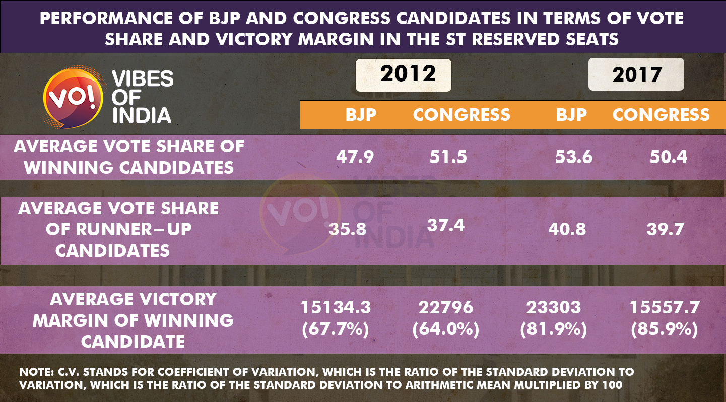 मोदी काल में भी 2012 में 27 आदिवासी आरक्षित क्षेत्रों में कांग्रेस ने 16 सीट यानि 59. 3 प्रतिशत पर जीत हांसिल की थी , जबकि भाजपा को महज को 10 सीटों पर ही जीत मिली थी ,प्रतिशत के लिहाज से सफलता 37 प्रतिशत हो जाती है। जबकि 2014 में राज्य की सभी 26 लोकसभा सीट पर कमल खिला ,जिसमे आदिवासी आरक्षित और आदिवासी बाहुल्य लोकसभा क्षेत्र शामिल थे।