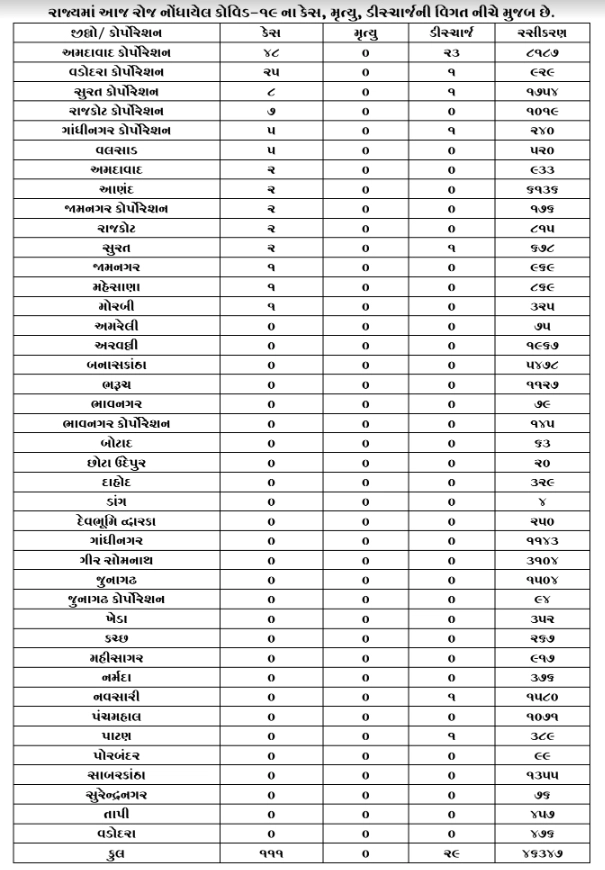 अहमदाबाद में कोरोना के सबसे ज्यादा 50 मामले हैं। वडोदरा में 25, सूरत में 10, राजकोट में 9, गांधीनगर में 5, वलसाड में 5, आणंद में 2, जामनगर में 3, मेहसाणा में एक और मोरबी में एक मामला सामने आया है.