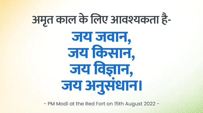 प्रधानमंत्री ने नया नारा देते हुए कहा कि अब ‘जय जवान, जय किसान, जय विज्ञान और जय अनुसंधान’ (Jai Jawan, Jai Kisan, Jai Vigyan and Jai Anusandhan )होगा। उन्होंने कहा कि आत्मनिर्भर भारत(Self reliant india) सरकारी एजेंडा या कार्यक्रम नहीं है, यह जनआंदोलन (Mass movement) है। 76वां स्वतंत्रता दिवस (Independence day) के अवसर पर प्रधानमंत्री नरेन्द्र मोदी (Prime Minister Narendra Modi )ने दिल्ली के प्रतिष्ठित लाल किले (Red Fort) पर 9वीं बार ‘तिरंगा’ फहराया। परंपराओं को जारी रखते हुए वह लाल किले की प्राचीर से राष्ट्र को संबोधित करते उन्होंने कहा कि देश ही नहीं, दुनिया के हर कोने में आन-बान और शान के साथ तिरंगा लहरा रहा है।