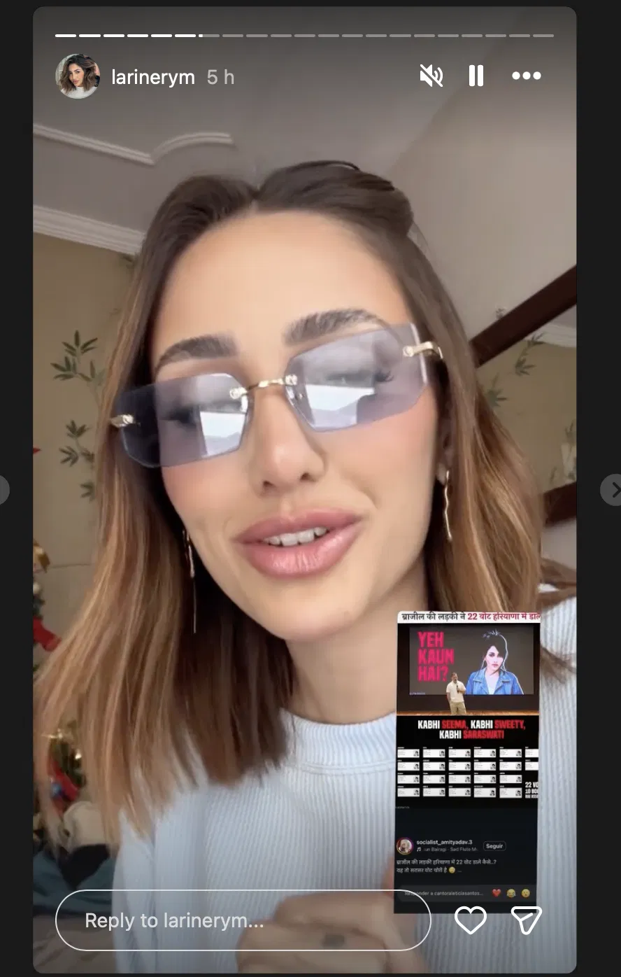 एक अन्य स्टोरी में, उन्होंने राहुल गांधी की प्रेस कॉन्फ्रेंस का क्लिप शेयर किया और पुर्तगाली में कैप्शन लिखा: “दोस्तों, कितनी अजीब बात है — मैं भारत में ‘रहस्यमयी ब्राज़ीलियाई मॉडल’ के नाम से मशहूर हो गई हूँ।”