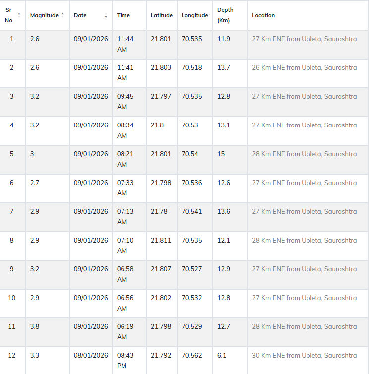 पहले बड़े झटके के बाद करीब एक घंटे तक छोटे-छोटे झटके (आफ्टरशॉक्स) आते रहे, और यह क्रम 9 जनवरी को दोपहर 11:45 बजे तक जारी रहा। वैज्ञानिकों के अनुसार, भूकंप का केंद्र उपलेटा से लगभग 27 से 30 किलोमीटर दूर पूर्व-उत्तरपूर्व (East-Northeast) दिशा में था। इसकी गहराई जमीन के नीचे 6.1 से 13.6 किलोमीटर के बीच आंकी गई है।