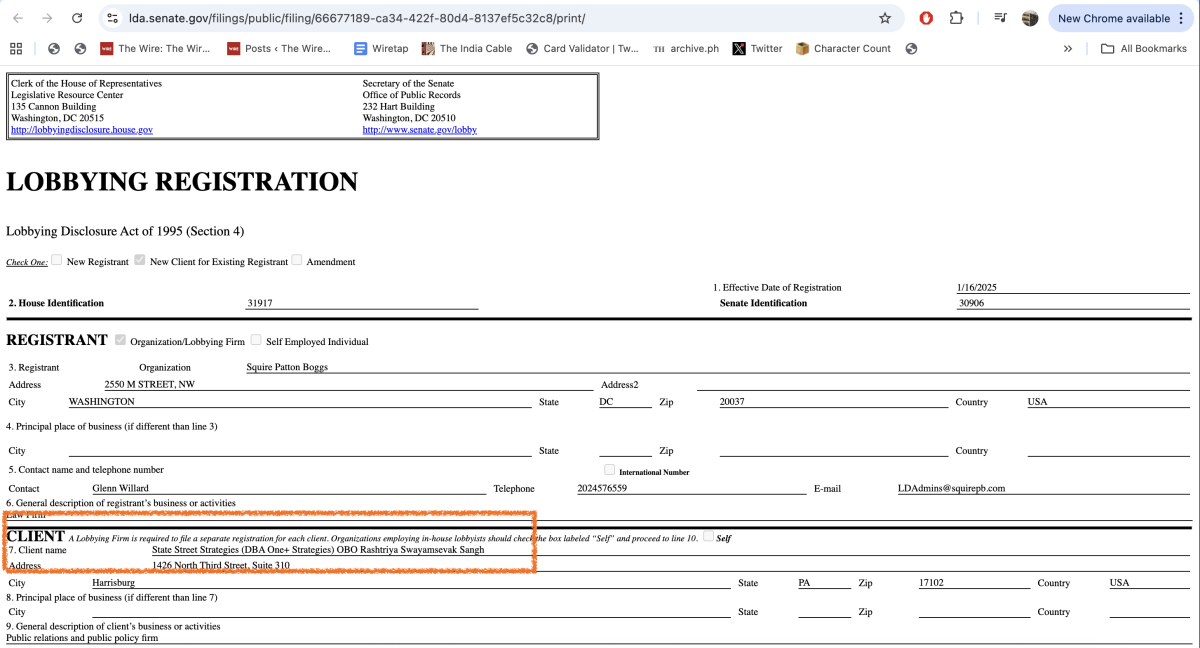 दस्तावेजों से पता चलता है कि लॉबिंग का यह जाल काफी जटिल है। इसमें क्लाइंट के रूप में सीधे RSS का नाम नहीं है, बल्कि “स्टेट स्ट्रीट स्ट्रैटेजीज” का नाम है जो “वन+ स्ट्रैटेजीज” के रूप में RSS की ओर से काम कर रही है।