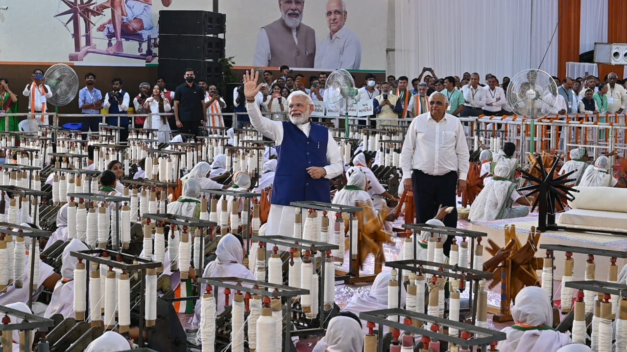 ऐतिहासिक साबरमती आश्रम के किनारे आज़ादी के अमृत महोत्सव के तहत आयोजित खादी उत्सव का उट्घाटन करते हुए प्रधानमंत्री नरेंद्र मोदी ने कहा ” आजादी के 75 वर्ष पूरे होने के उपलक्ष्य में, 7,500 बहनों-बेटियों ने एक साथ चरखे पर सूत कातकर नया इतिहास रच दिया है.आज मुझे भी चरखा चलाने का मौका मिला। उन्होंने भावुक होते हुए कहा कि ” मेरे छोटे घर में भी एक कोने में खादी का चरखा होता था , माँ जीवकोपार्जन के लिए खाली समय में चरखा चलातीं थी। साबरमती का ये किनारा आज धन्य हो गया है। खादी को भारत के गौरव से जोड़ते हुए प्रधानमंत्री ने कहा कि अब खादी के लिए वैश्विक स्तर पर अपनी साख बनाने का समय आ गया है। और गुजरत उसे लीड कर रहा है। सोलर चरखा से गुजरात ने फिर देश का नेतृत्व किया है।