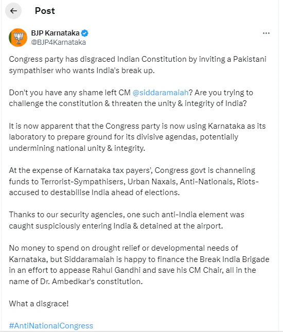 कौल के ट्वीट के जवाब में, कर्नाटक भाजपा ने लेखक को निमंत्रण देने के लिए कांग्रेस पार्टी और मुख्यमंत्री सिद्धारमैया की आलोचना की। “यह स्पष्ट है कि कांग्रेस पार्टी कर्नाटक को अपने विभाजनकारी एजेंडे के लिए परीक्षण स्थल के रूप में उपयोग कर रही है, जो संभावित रूप से राष्ट्रीय एकता और अखंडता को खतरे में डाल रही है।” भाजपा ने जोर देकर कहा, साथ ही “भारत विरोधी तत्व” को देश में प्रवेश करने से रोकने के लिए सुरक्षा एजेंसियों की भी सराहना की।