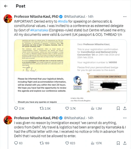 “लोकतांत्रिक और संवैधानिक मूल्यों की वकालत करने के लिए मुझे भारत में प्रवेश से वंचित कर दिया गया। कर्नाटक सरकार (कांग्रेस शासित राज्य) द्वारा एक सम्मानित प्रतिनिधि के रूप में आमंत्रित किए जाने के बावजूद, केंद्र सरकार ने मुझे प्रवेश से इनकार कर दिया। मेरे यूके पासपोर्ट और ओसीआई सहित मेरे सभी दस्तावेज़ वैध और वर्तमान थे,” कश्मीरी-पंडित और यूके में वेस्टमिंस्टर विश्वविद्यालय में प्रोफेसर निताशा कौल ने ट्वीट किया।