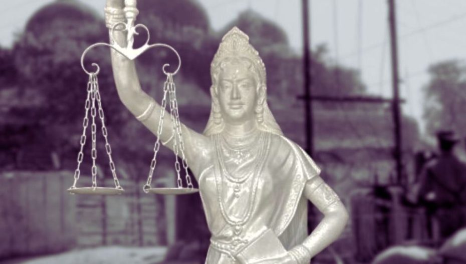 (IMAGE: The new ‘Lady Justice’ statue. In the background is the Babri Masjid which stood in Ayodhya till 1992.)