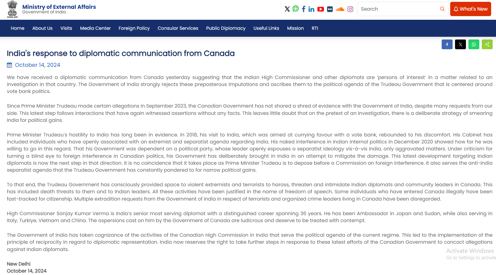 “We have received a diplomatic communication from Canada suggesting that the Indian High Commissioner and other diplomats are ‘persons of interest’ in an investigation. The Government of India strongly rejects these preposterous imputations, attributing them to the political agenda of the Trudeau Government, which is driven by vote bank politics,” the MEA stated.