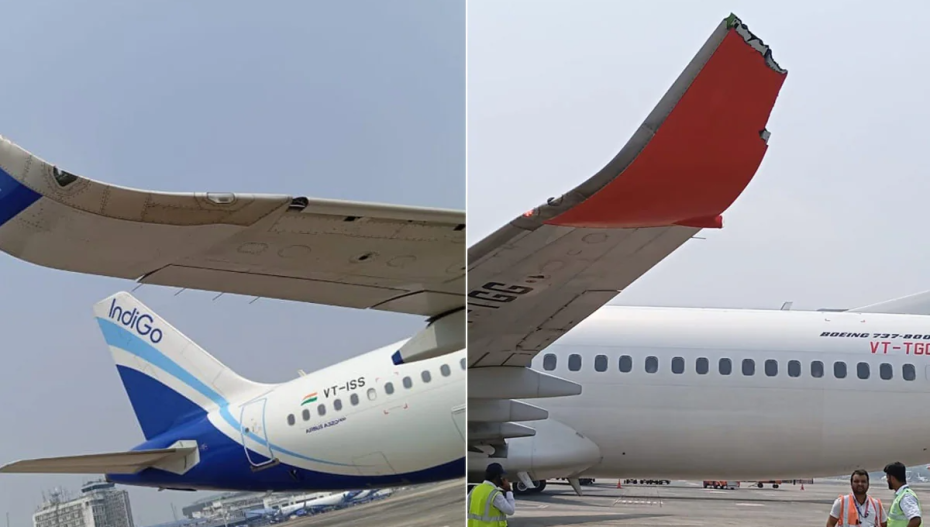 The wingtip of a taxiing IndiGo aircraft grazed a stationary Air India Express plane at Kolkata Airport on Wednesday. The Air India Express was awaiting clearance for its scheduled operation to Chennai.
