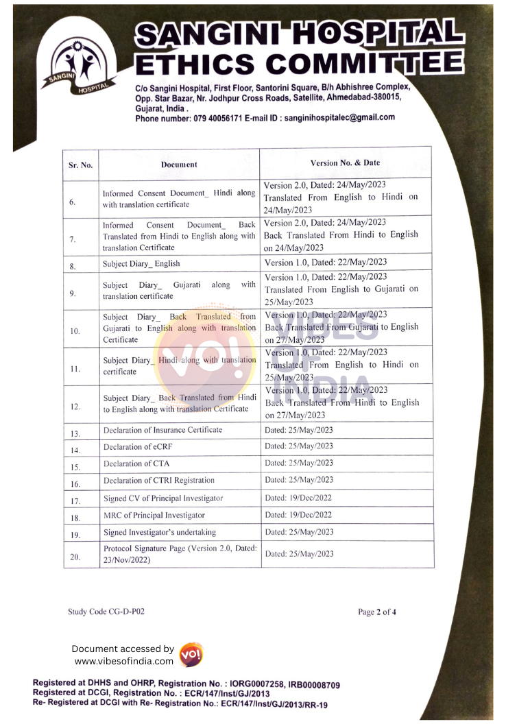 There is a document dated June 26, 2023, on the letterhead of the Sangini Hospital Ethics Committee which approves the arrangement. Ironically, the agreement signed was in November 2024, but this ethics committee approval is dated June 26, 2023. It lists Dr Pratik Shah, Dr Atish Shah, Dr Janak Khambholja, Dr Amit Shah, Ms Sejal Sutaria, Mr Meet Jhatakia, and Mrs Shiklpa Dhankecha (BE Hindi), the layperson of the ethics committee, as agreeing to the terms and conditions.