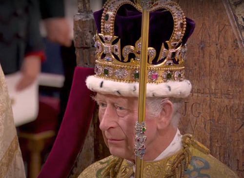 The big west door of the abbey served as the king’s entrance. He walked slowly through the church behind his wife, Camilla, wearing a long, dark red robe. A congregation of about 2,200 people welcomed him, including world royalty, heads of state and government, and local notables.
