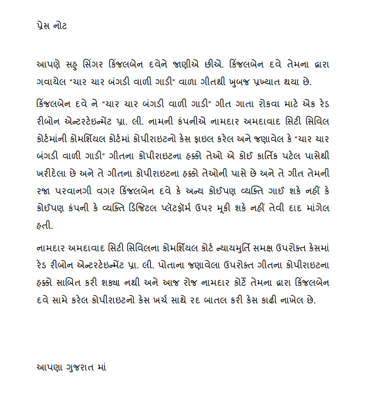 Gujarati singer, Kinjal Dave has won a copyright case in the Ahmedabad City Civil Court over the Gujarati song “Char Char Bangdi Vali Gadi”. Advocates Pratik Chaudhary and Jatin Trivedi, representing Dave, informed the media that the case was filed by Red Ribbon Entertainment Pvt. Ltd., a company claiming to hold the copyright to the song.