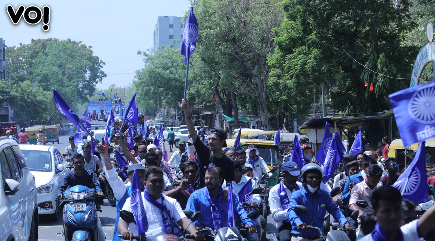 Gujarat MLA, Jignesh Mevani, along with thousands of people today took part in a bike rally at Sarangpur in Ahmedabad and paid tribute Dr Babasaheb Ambedkar on his 131st birth anniversary. The leader and scores of men and women paid tribute by placing flower garlands around monumental figure of Ambedkar.