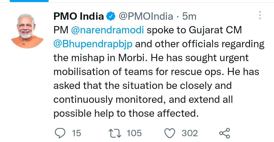 Meanwhile, Prime Minister Narendra Modi, who is on a three-day visit to Gujarat ahead of the Assembly elections, spoke to Chief Minister Bhupendrabhai Patel and sought urgent mobilisation of teams for the rescue operations. Prime Minister’s Office in a tweet wrote, “PM @narendramodi spoke to Gujarat CM and other officials regarding the mishap in Morbi. He has sought urgent mobilisation of teams for rescue ops. He has asked that the situation be closely and continuously monitored, and extend all possible help to those affected.”