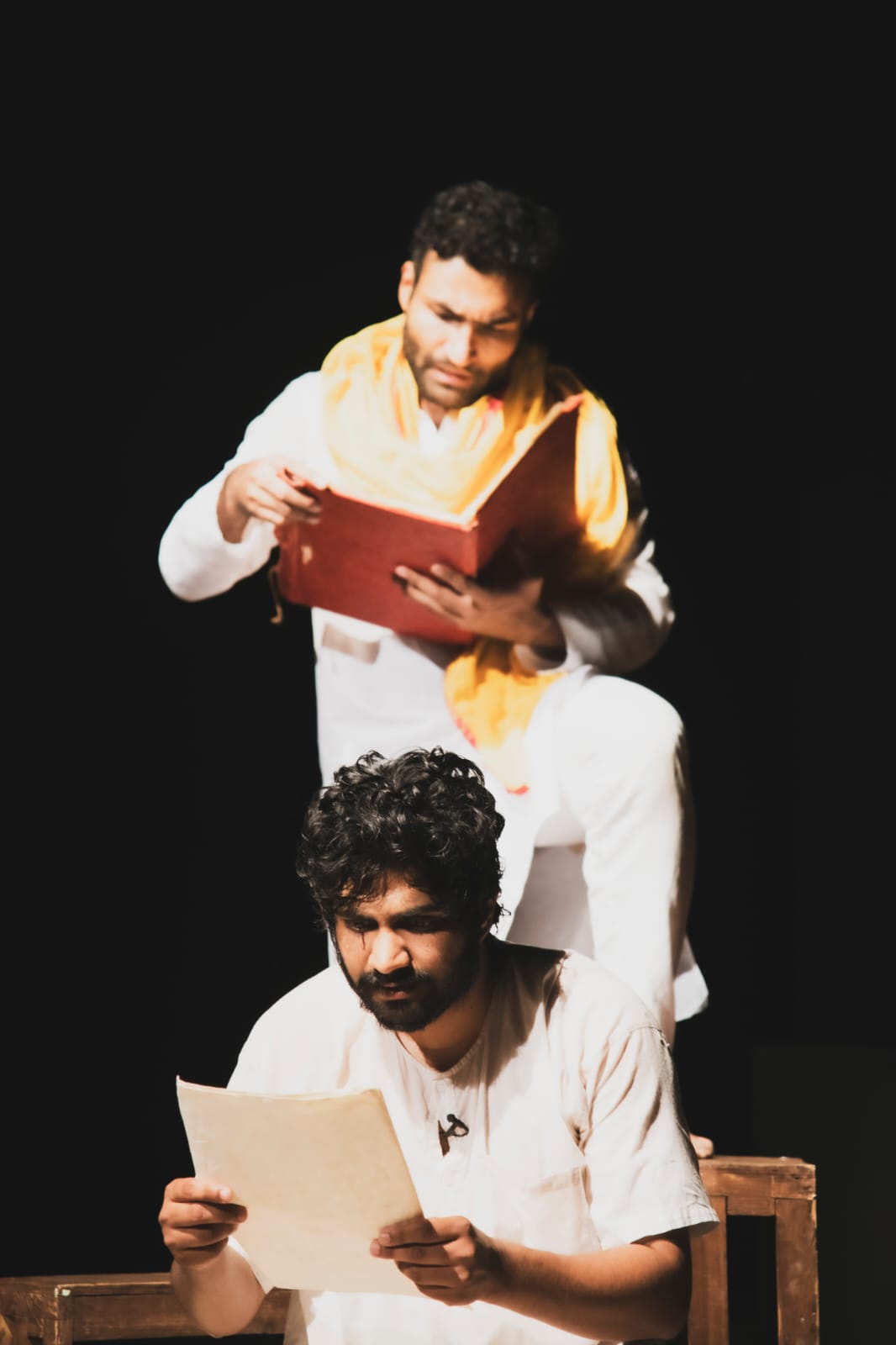 Minimalist theatre is actor-driven by its very nature and as the play progresses, the two actors play a range of roles from the people in Tukaram’s life. Director Gerish Khemani has deliberately chosen to cast two young men in the lead roles though Tukaram was close to 50 years old when he died. The play is dialogue driven, but there is action that spans the whole stage as two actors, one clad in a dhoti, the other in pyjamas, move around vigorously, sometimes falling to the ground, sometimes into each other’s arms.