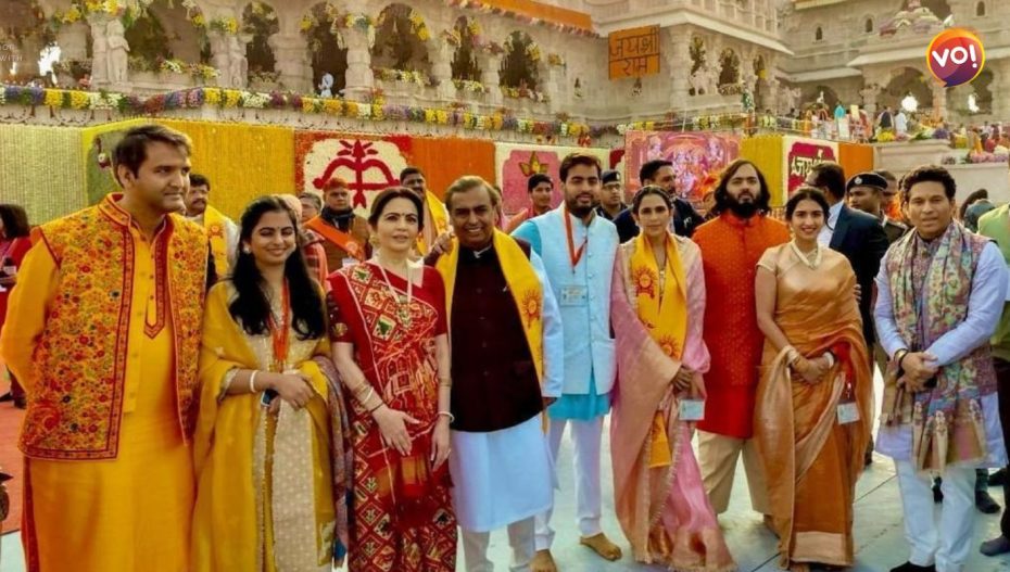 In a grand event held on Monday, the Pran Pratishtha ceremony in Ayodhya saw the presence of several esteemed guests, including Nita and Mukesh Ambani. Nita Ambani, known for her penchant for homegrown brands and local weavers, graced the occasion in a deep red silk saree, complemented by a beautiful beige shawl draped over her bun-adorned hair.