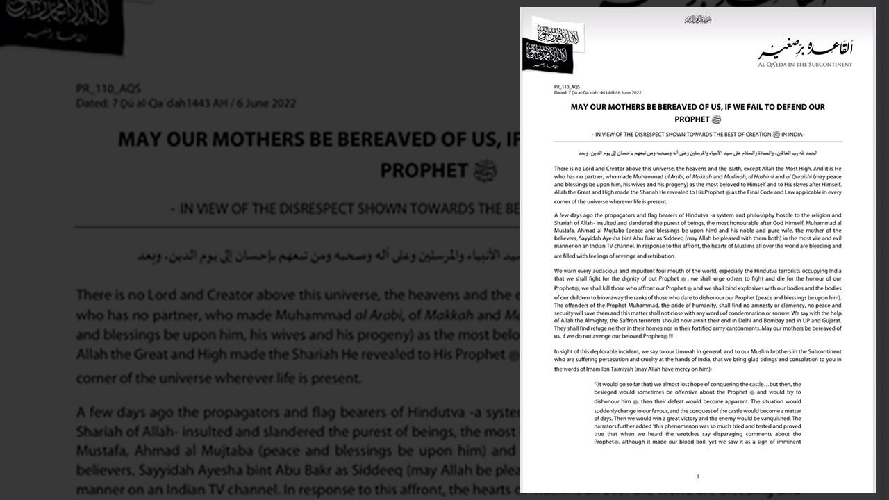 Al-Qaeda has stated, “We shall kill those who affront our Prophet and we shall bind explosives with our bodies and the bodies of our children to blow away the ranks of those who dare to dishonour our Prophet… The saffron terrorists should now await their end in Delhi, Bombay, UP and Gujarat.”