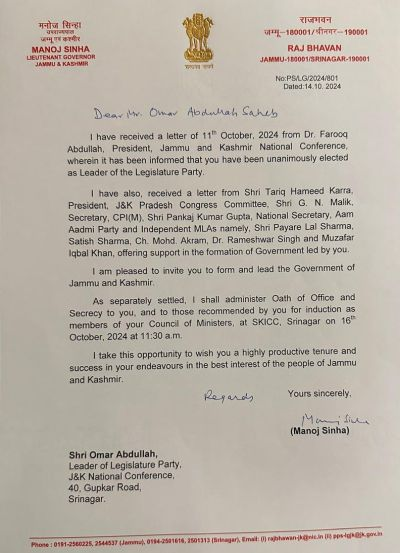 In a letter addressed to Abdullah, Sinha wrote, “I have received a letter dated 11th October 2024 from Dr Farooq Abdullah, President of the Jammu and Kashmir National Conference, informing me that you have been unanimously elected as the Leader of the Legislature Party.”