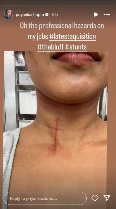 Bollywood superstar Priyanka Chopra, currently busy filming her upcoming movie “The Bluff,” encountered a professional hazard on the film set. The actress shared a photo on her Instagram story revealing a deep scratch on her throat. In the caption, she humorously acknowledged the challenges of her job, writing, “Professional hazards at my job #latestacquisition #thebluff #stunts (sic).”
