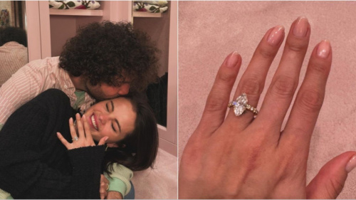 In the images, Selena is seen proudly displaying her engagement ring. One photo shows her admiring the ring while seated on a lawn, seemingly enjoying a picnic. Another captures a tender moment of the couple cuddling.