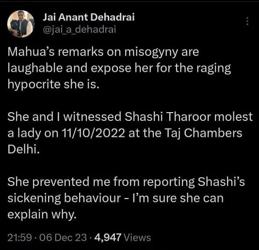 - This cryptic statement followed an earlier, now-deleted post on December 6th, where Dehadrai made the explosive claim: “Mahua (Moitra) and I witnessed Shashi Tharoor molest a lady on 11th October 2022 at the Taj Chambers Delhi.”