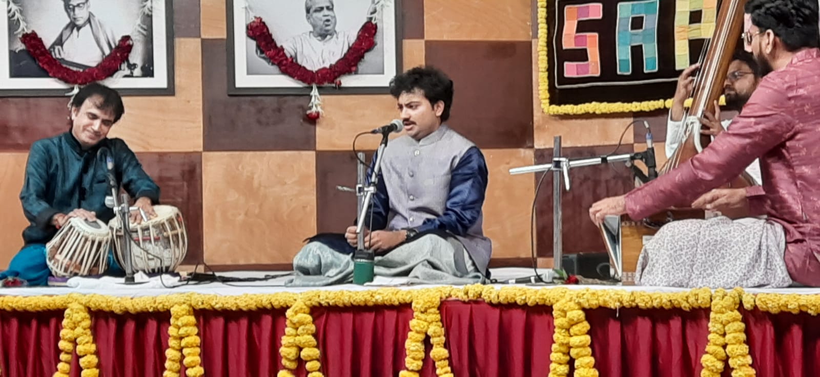 The first performance of the evening, which began at 9 pm and lasted one hour, was by young vocalist Shadaj Iyer, who performed Raag Jhinjhoti, followed by four short compositions (rachnas). He was accompanied by Hemant Joshi on the tabla and Nilay Salvi on the harmonium.